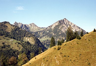 Ungewöhnlicher Blick in die Spitzingseer Berge auf Höhe der Neuhütte. Von links: Ruchenköpfe, Rotwand, Hochmiesing